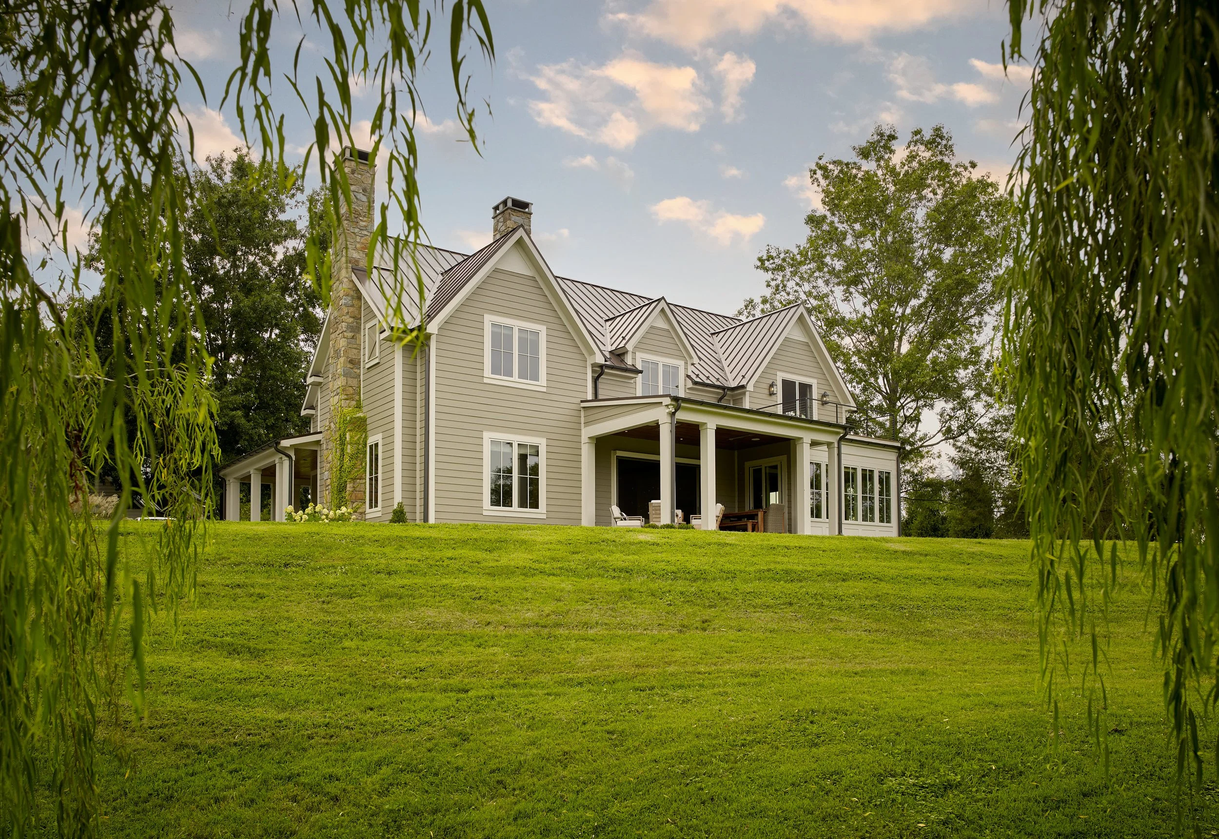 The final result is a warm, airy 4,000 square-foot residence that balances vernacular forms with contemporary spatial clarity. The exterior blends traditional farmhouse elements such as a stone chimney, clapboard siding, and expansive porches, all while respecting the existing material palette of the neighboring structures. A swooping stone arch at the side entryway is a respectful nod to a similar form on the refurbished guest house.
